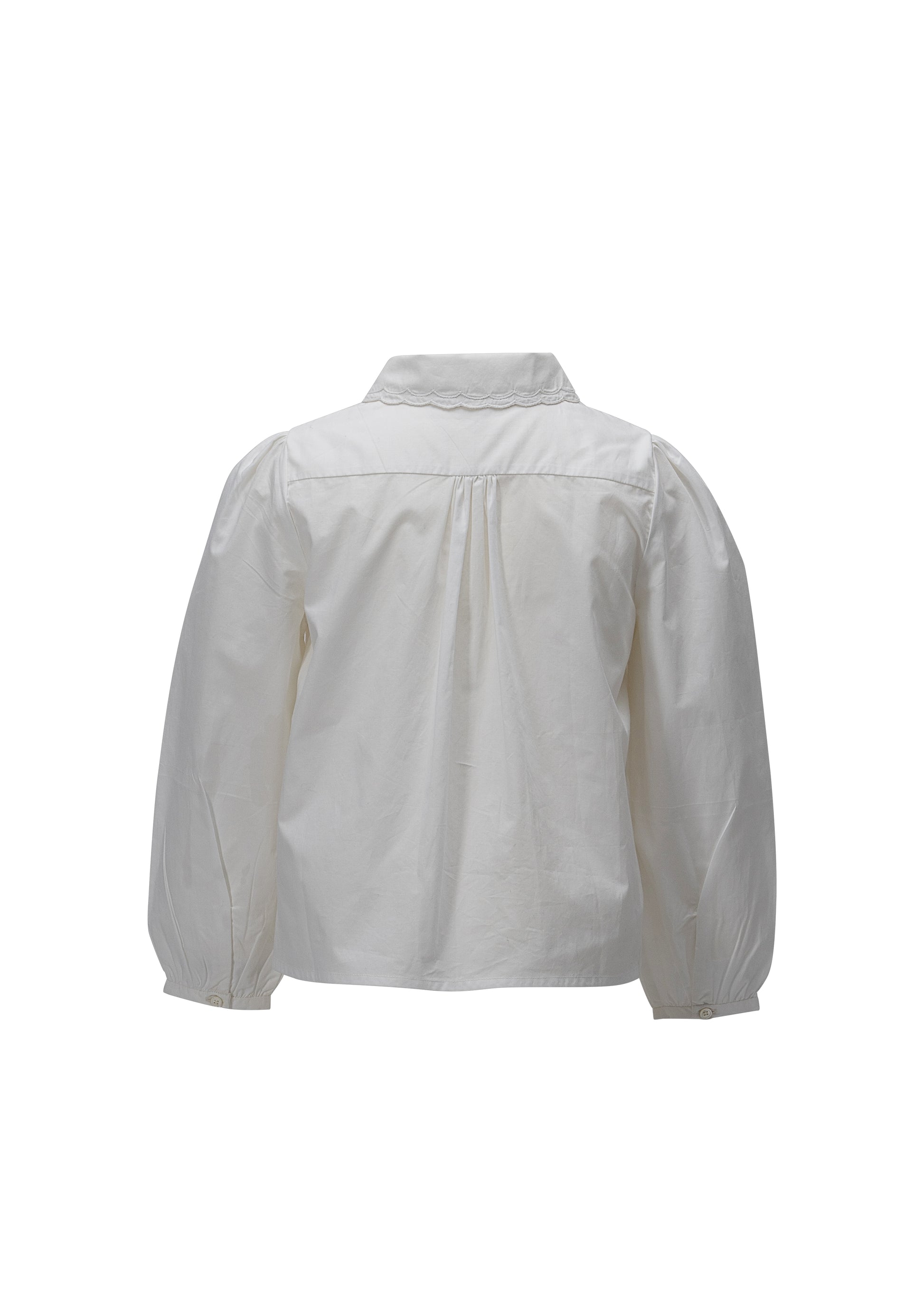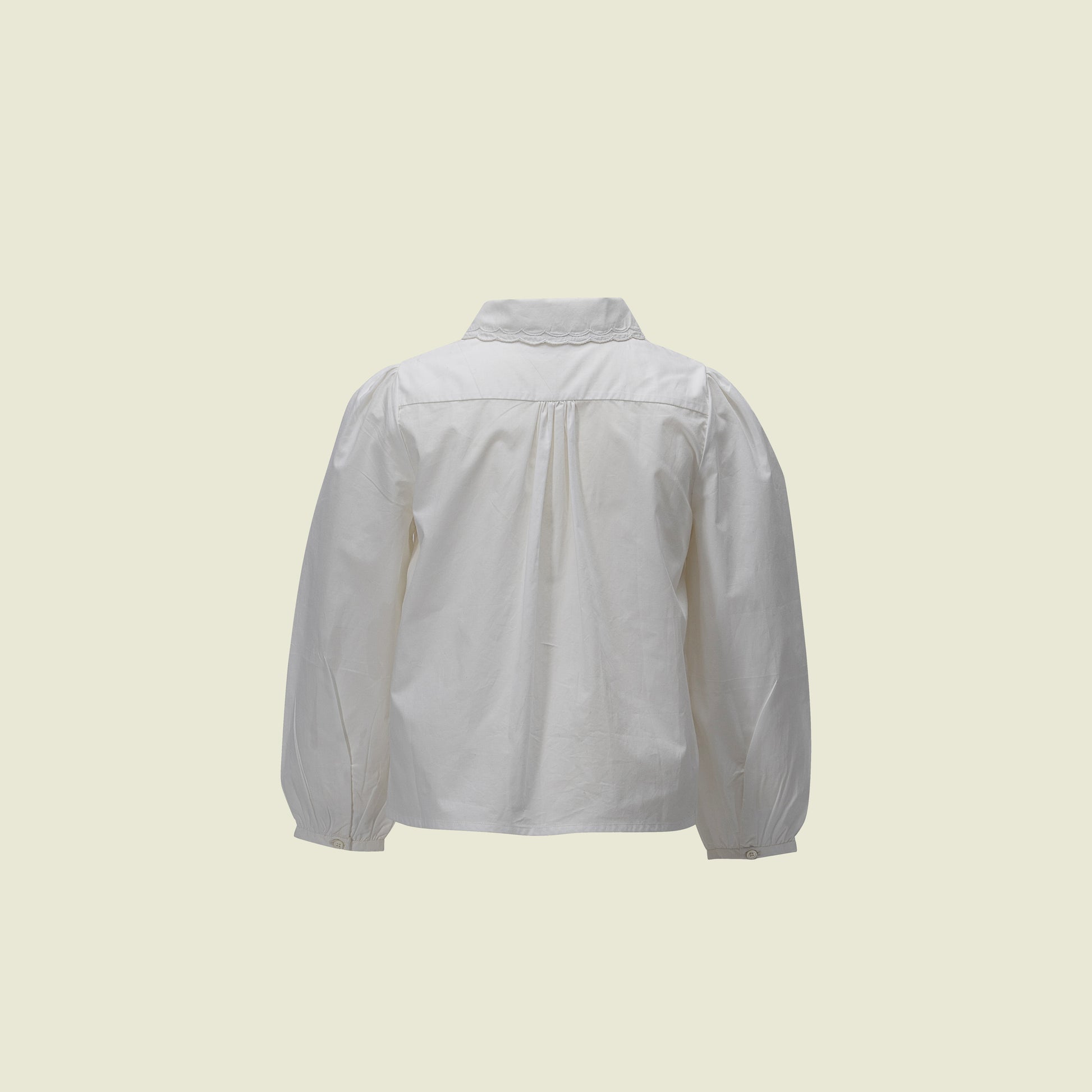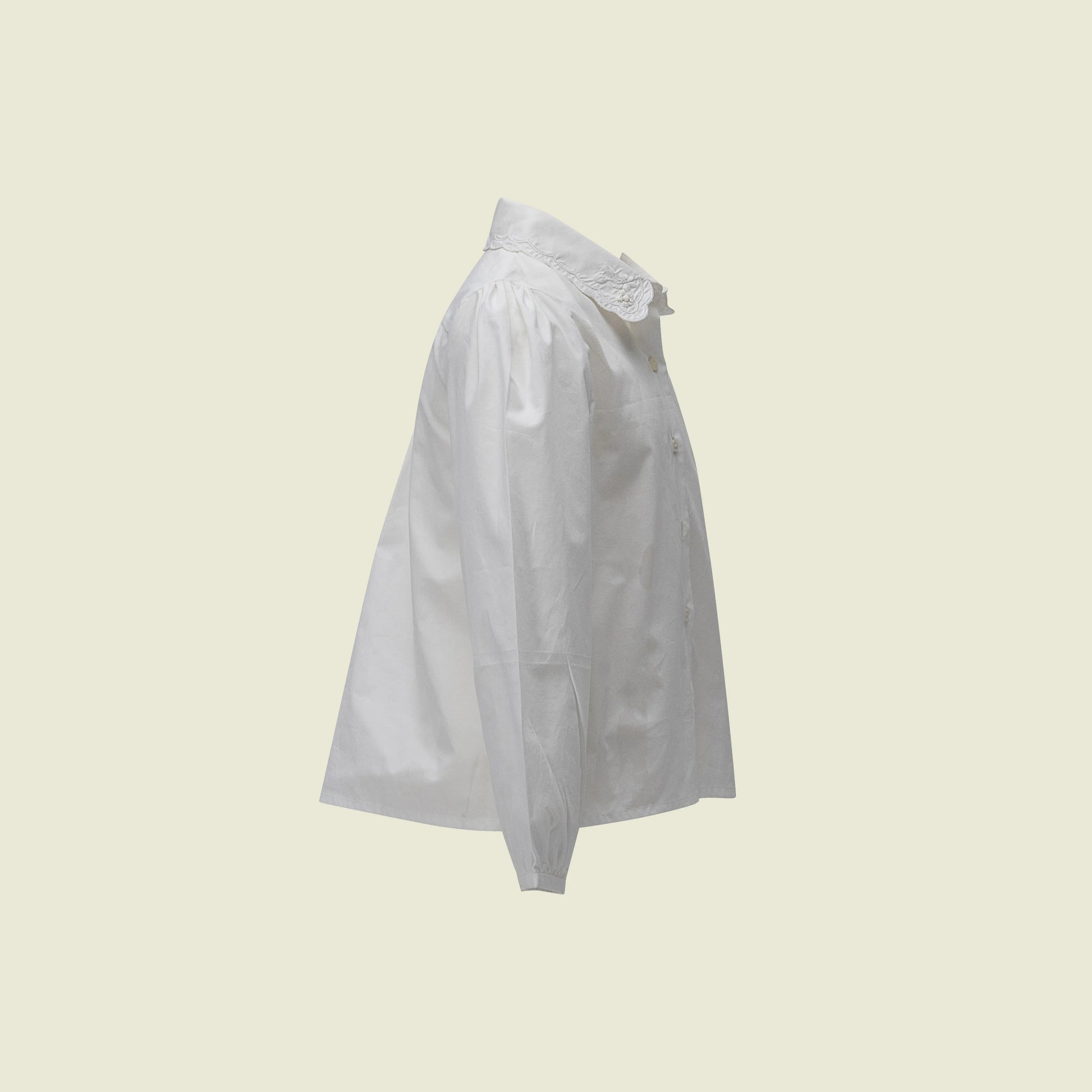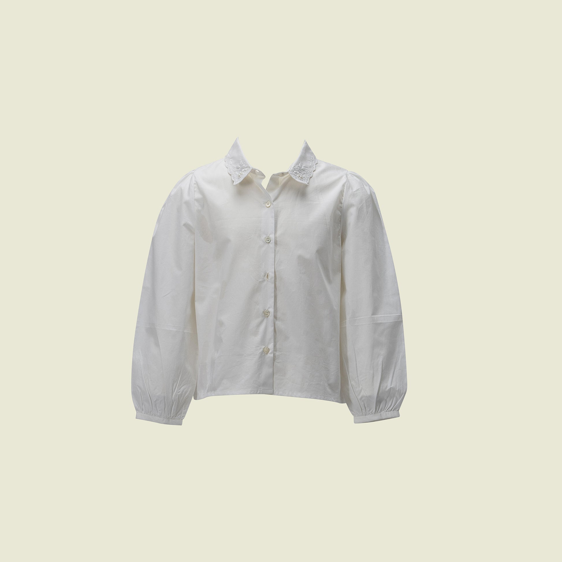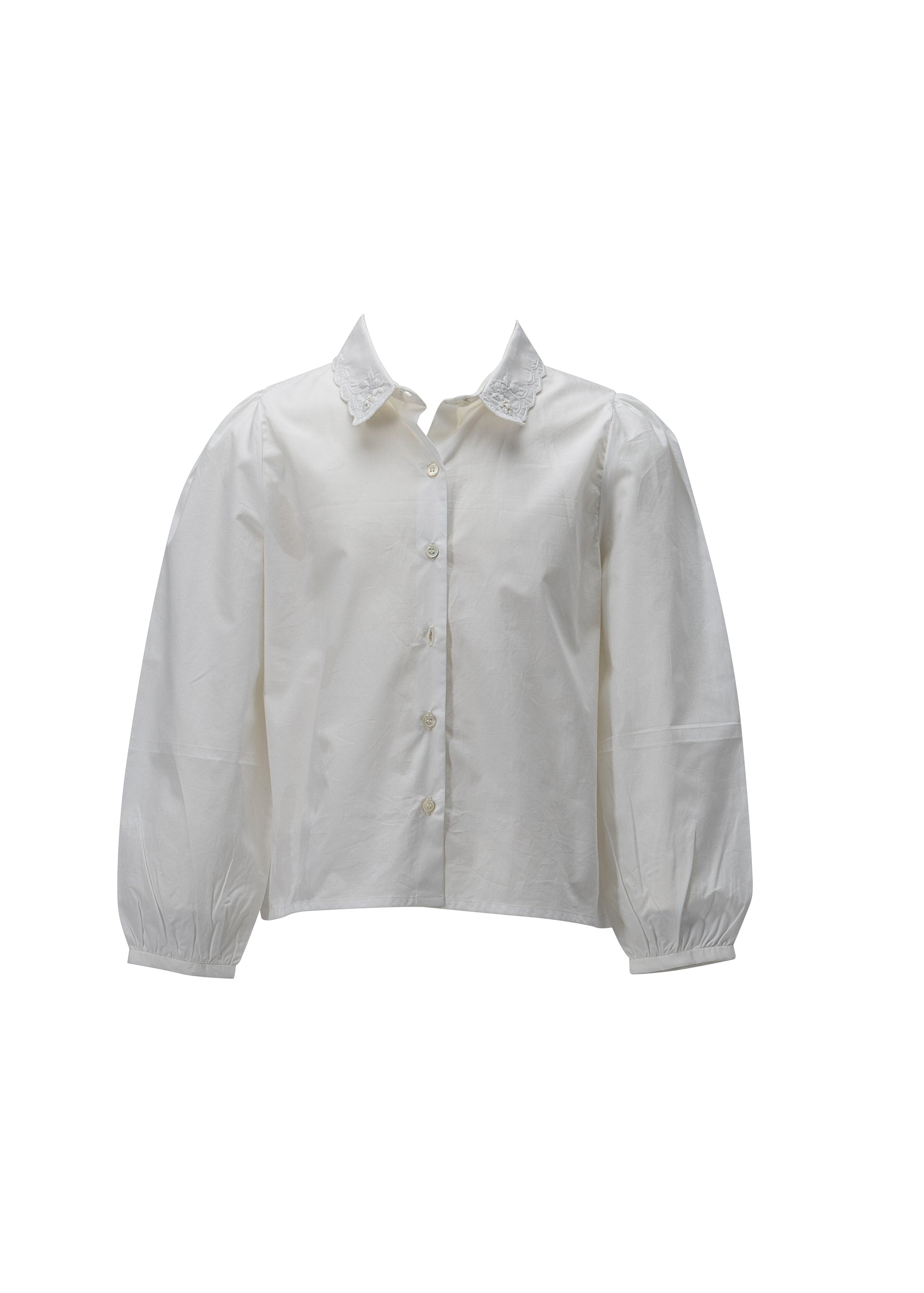 Soft tailored shirt in fine cotton poplin, beaming with charm and elegance, featuring gentle puff sleeves and tone-on-tone delicately embroidered scalloped collar. Light, breathable, classy; effortlessly pairs with any silhouette!