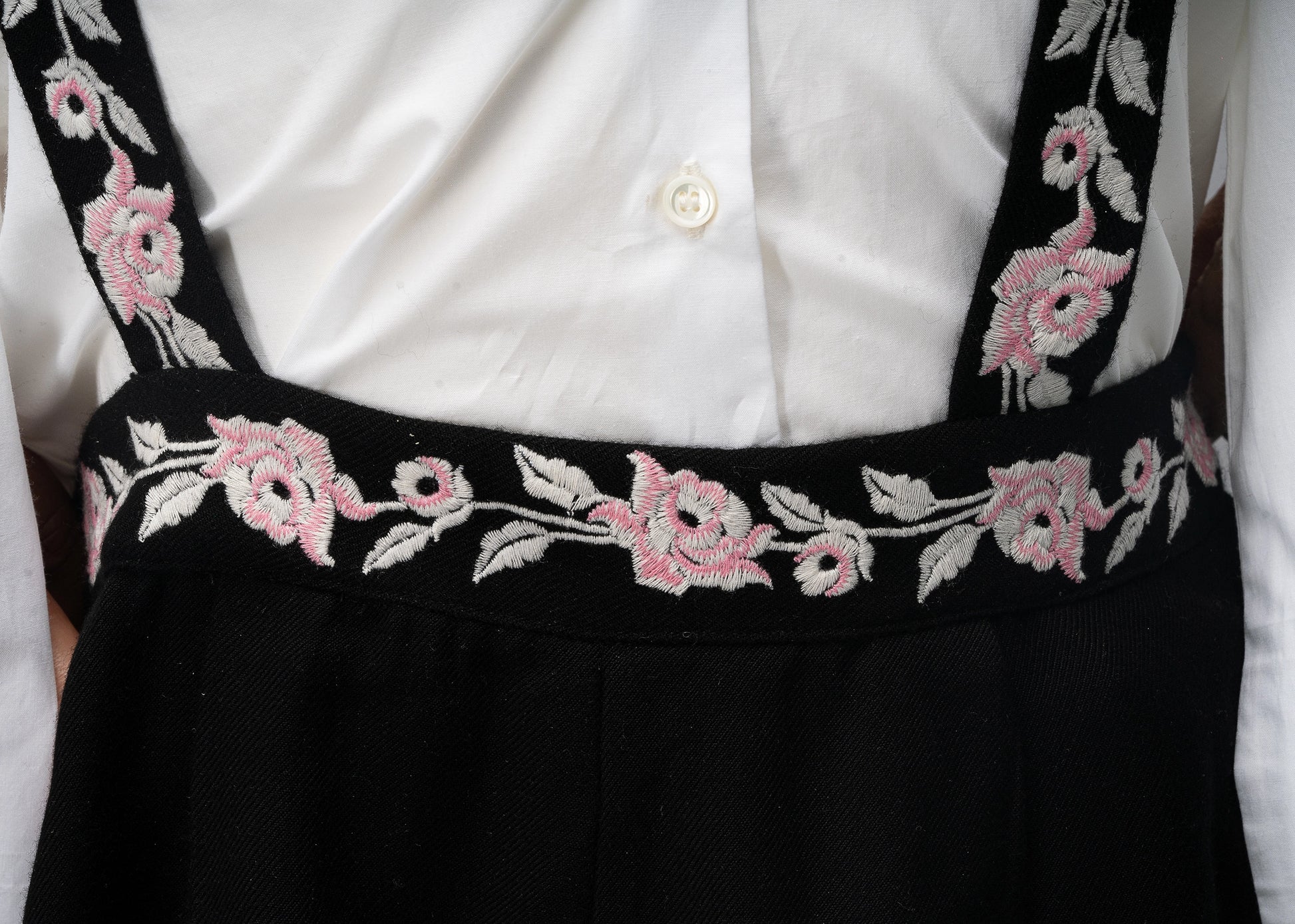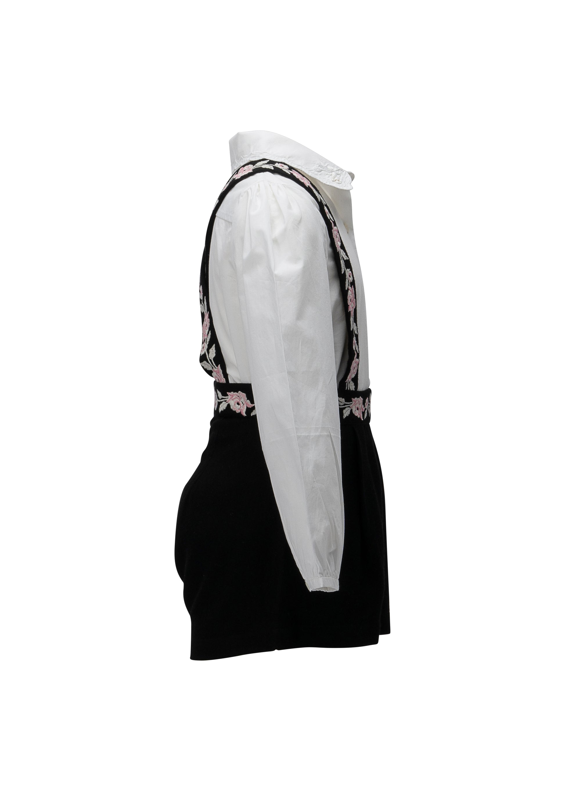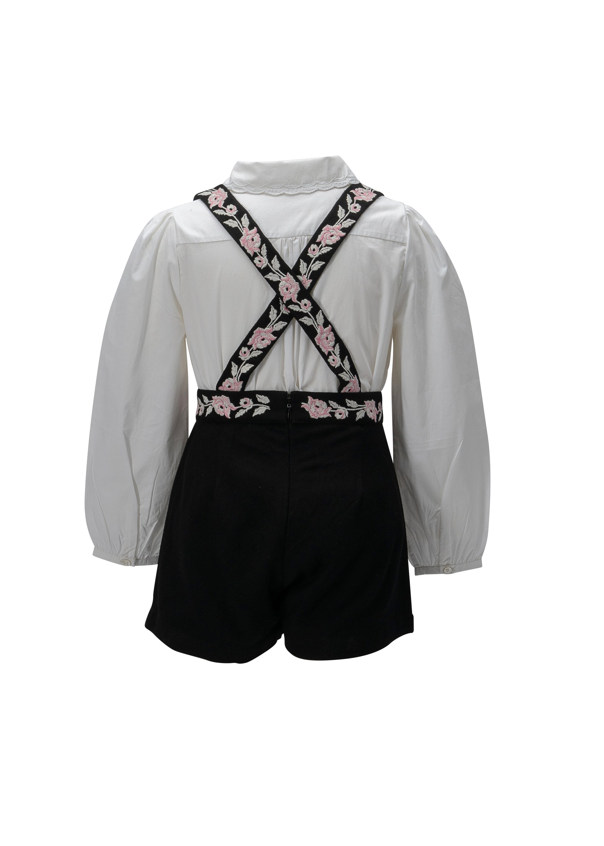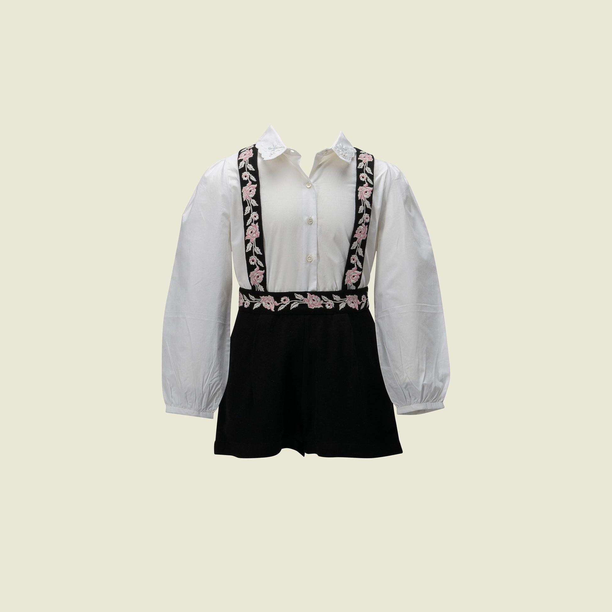 A beautiful pair of shorts, essentially soft against delicate skin with fully detachable suspenders. Adorned with rose motifs in blush and ivory threads. Paired here with our lovely Akari shirt. The perfect piece for heritage charm!