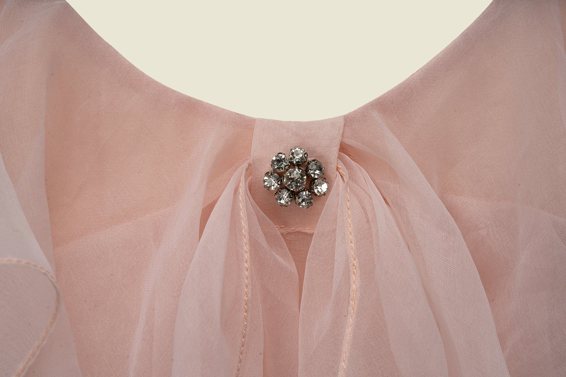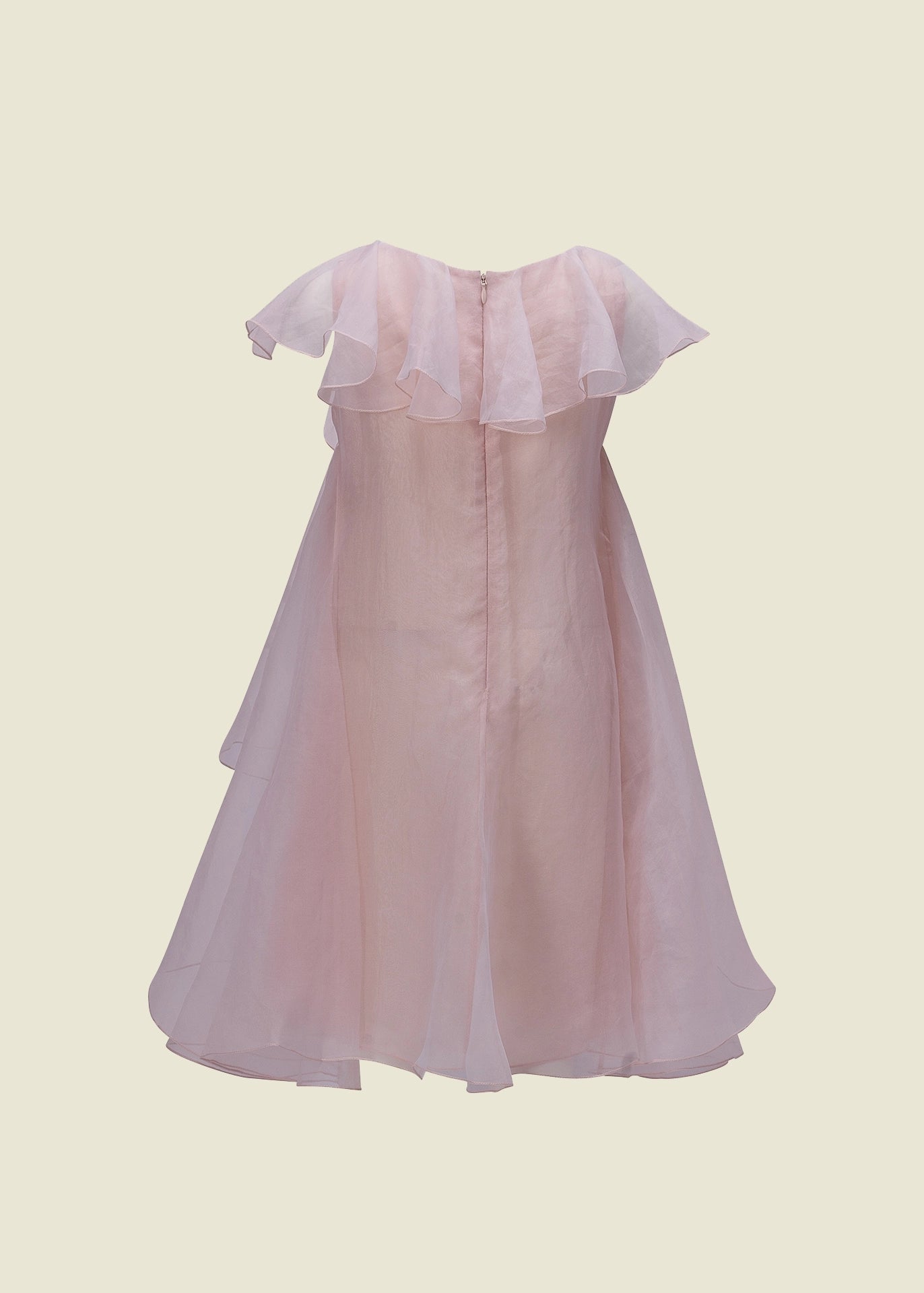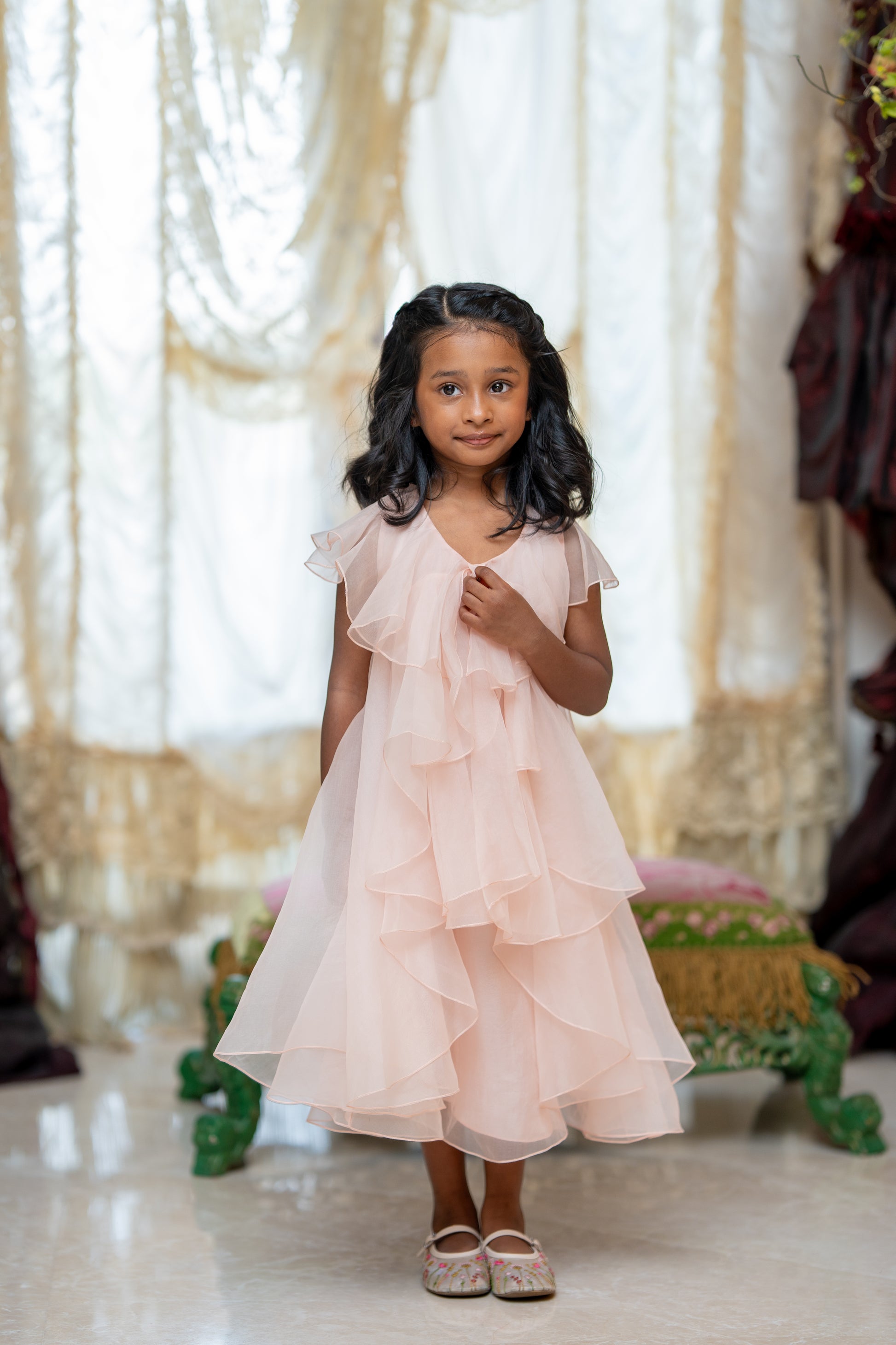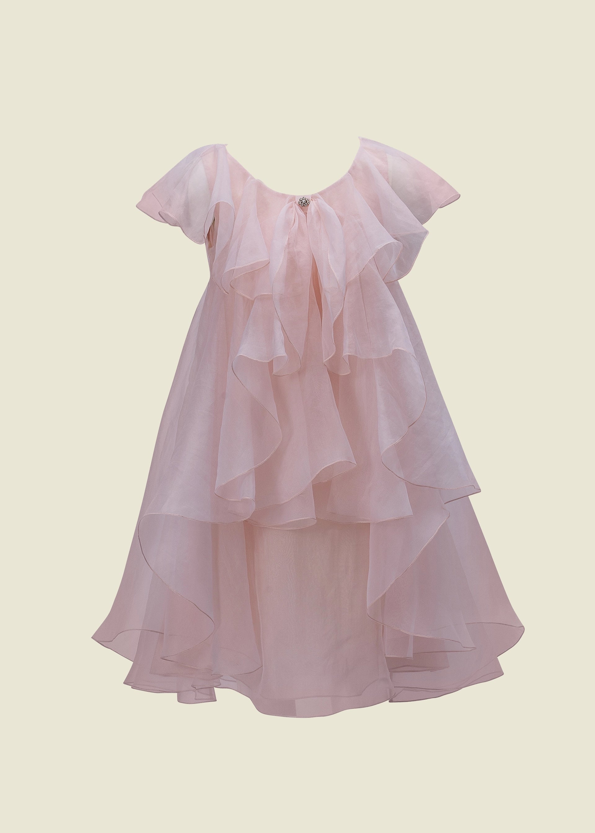 As light as the cloud and floats like a dream! This one of a kind dress with cascading soft layers of organza traces her every step, and a touch of sparkle for her shine.