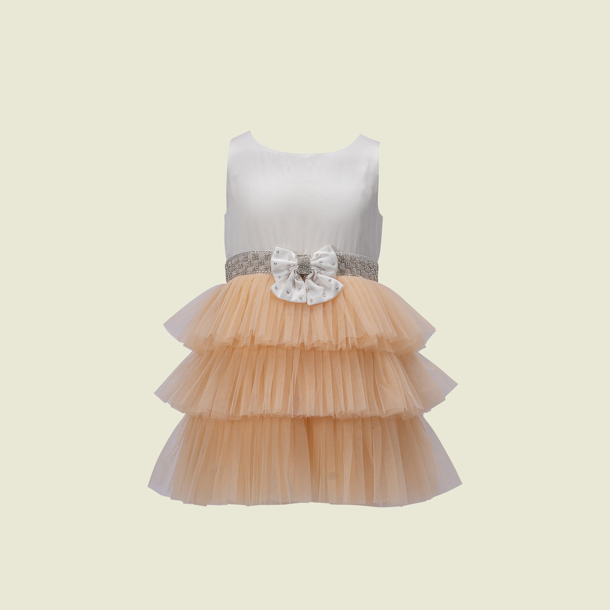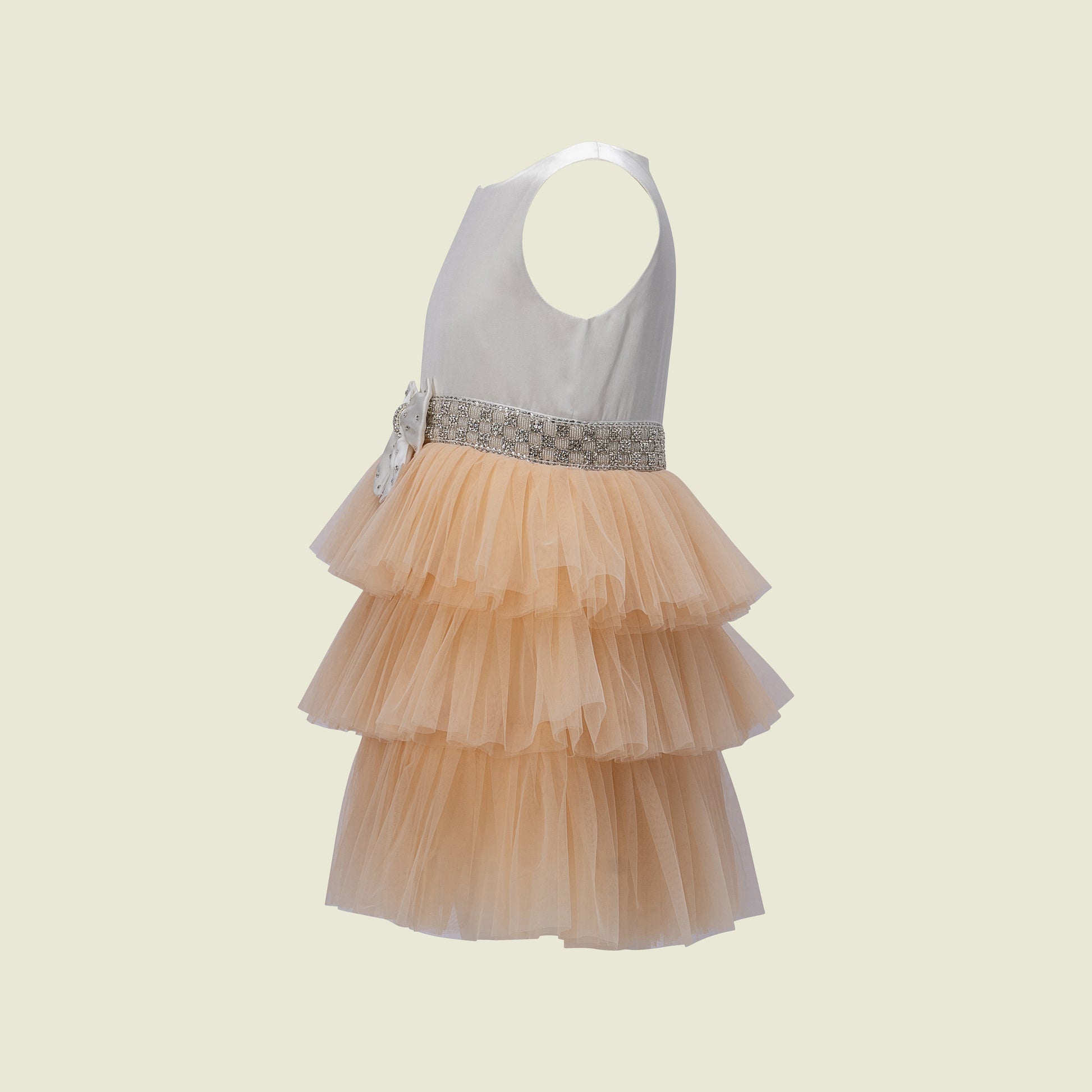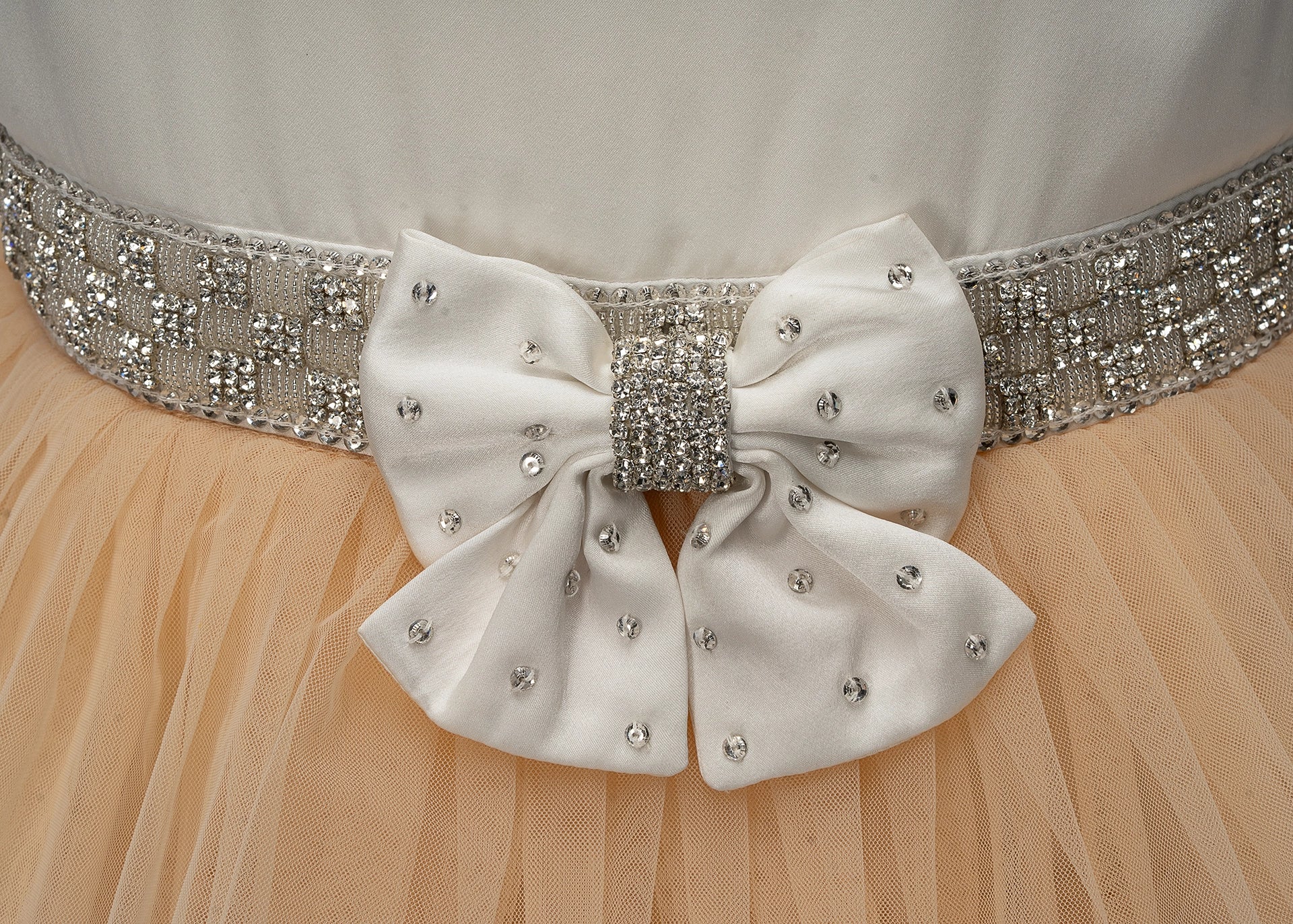 An exquisite creation born in the quite hands of our atelier! A luminous satin bodice meets tiers of soft sand tulle. The highlighting intricate waistline is fully hand-embellished with crystals and beads all around, finished with a wonderfully handcrafted bow with rich stone tie - a signature of Tilahn's craftsmanship!