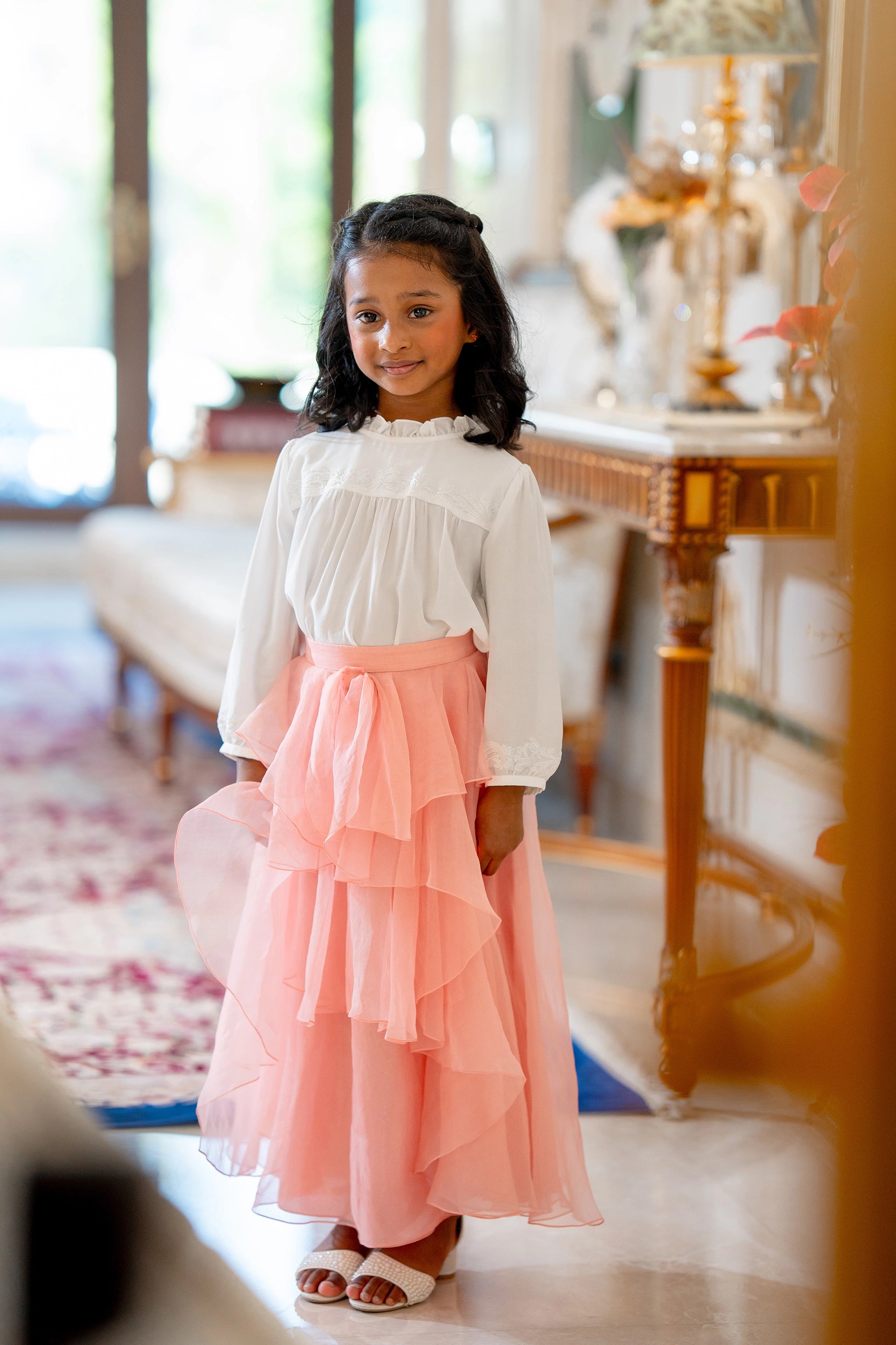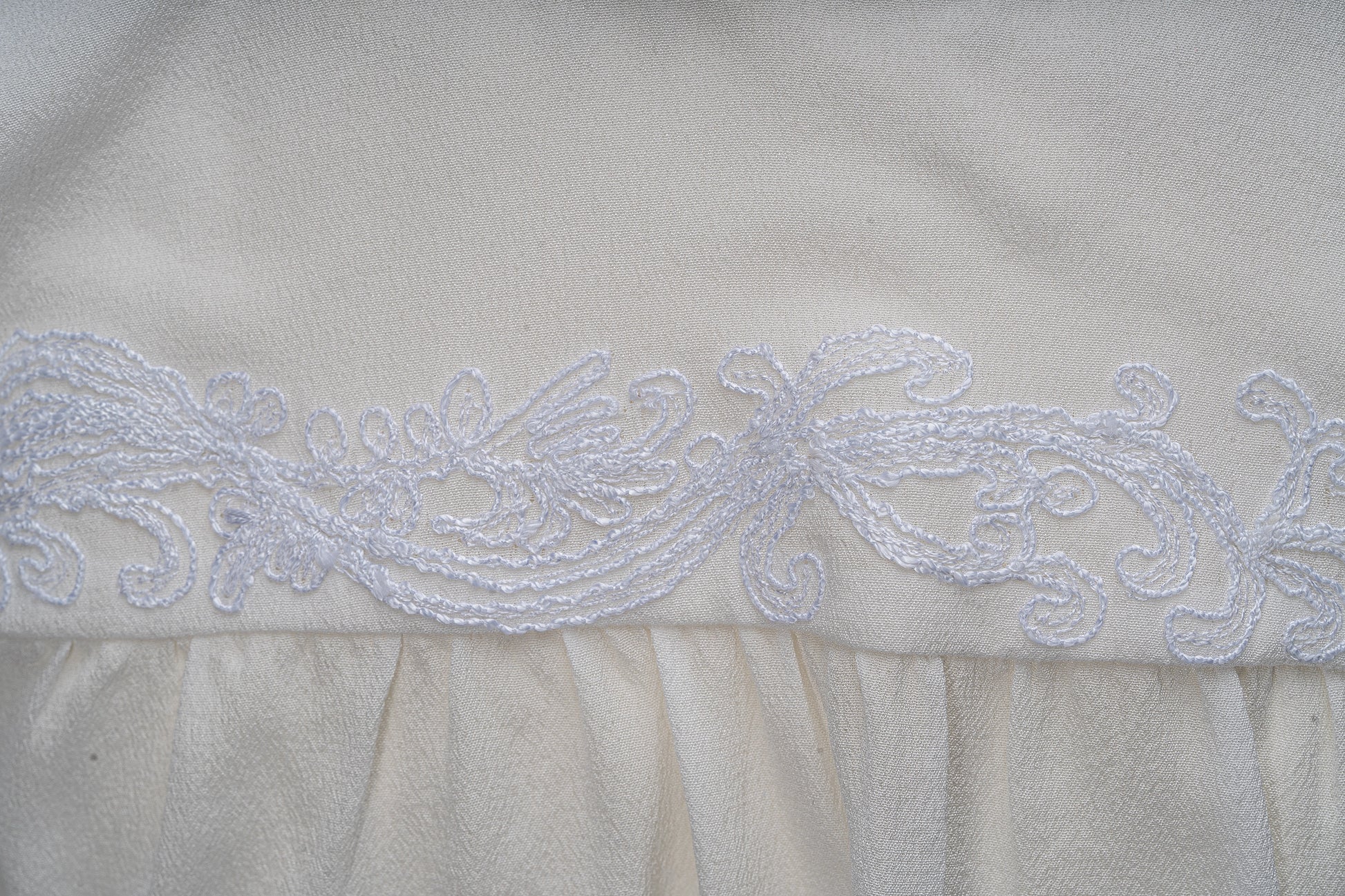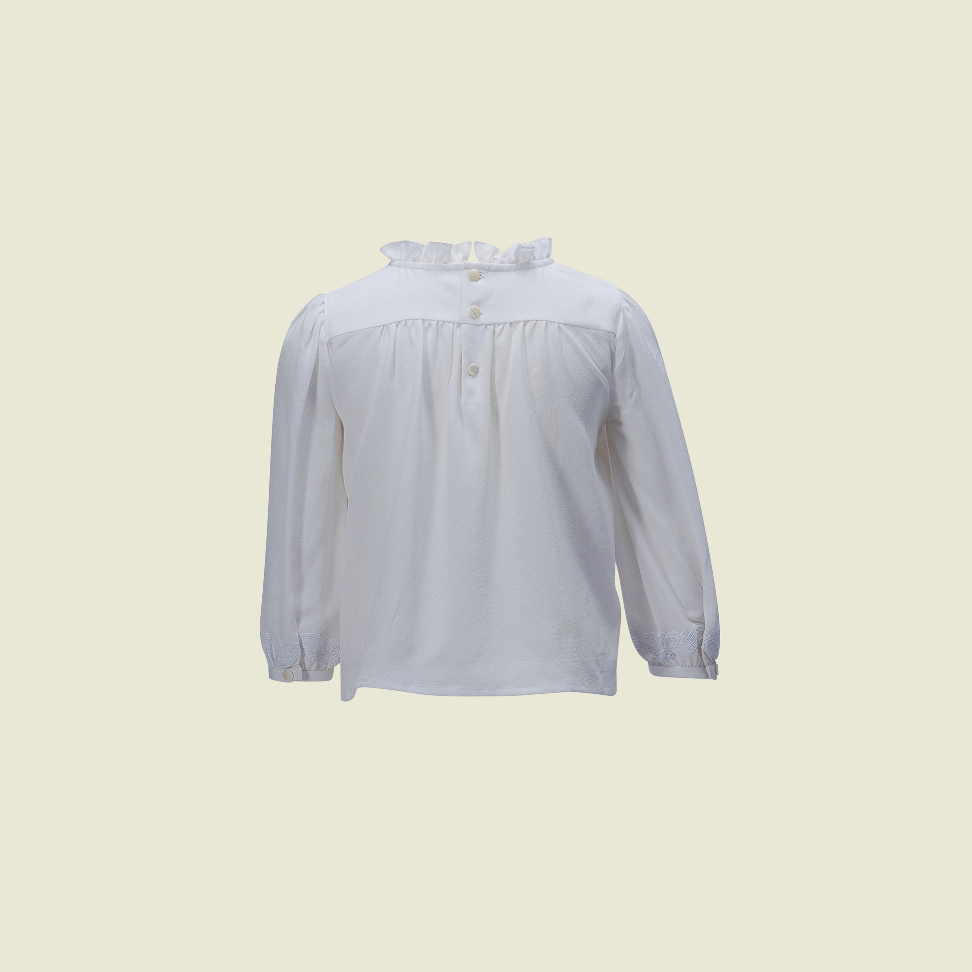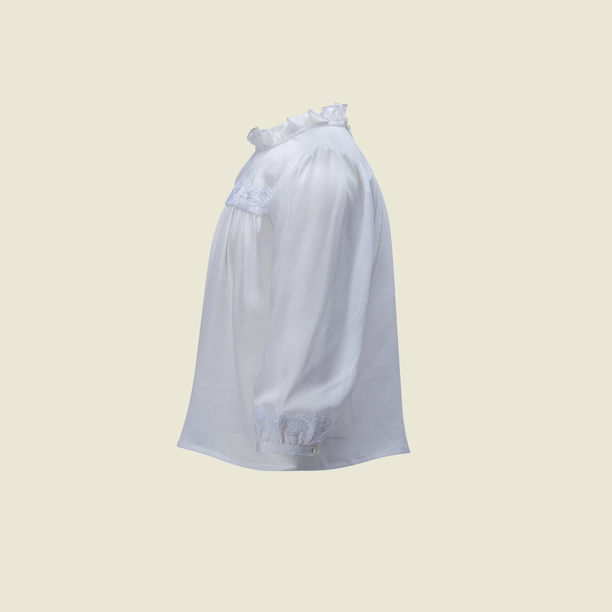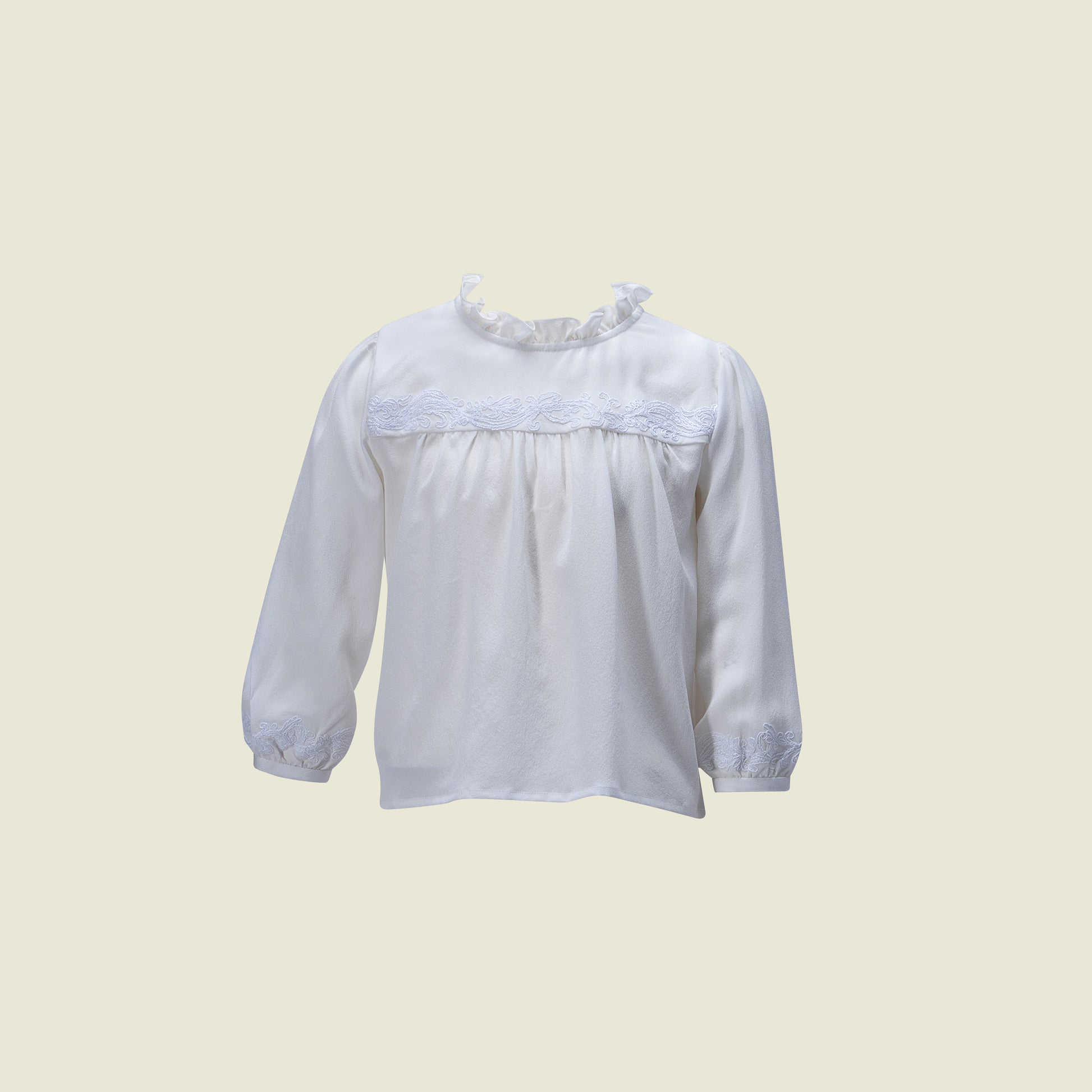 Crafted in pure wafer thin crepe silk with delicate ivory thread embroidery gracing the yoke and cuffs, and a soft ruffled neckline - a classic.