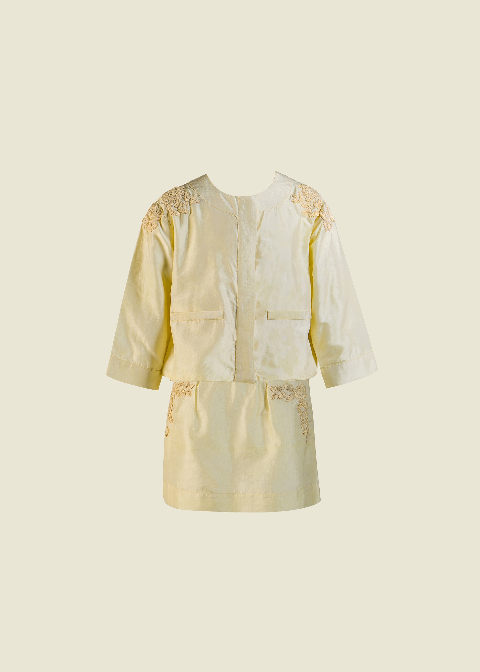 Tailored jacket and skirt set in fine silk taffeta. Champagne colour tone on tone flower motifs thread work on both jacket and skirt for an ultra chic look. Our styling tip: wear as a set or simply dress up a pair of jeans with jacket, and skirt with a t-shirt for a cool kid look!