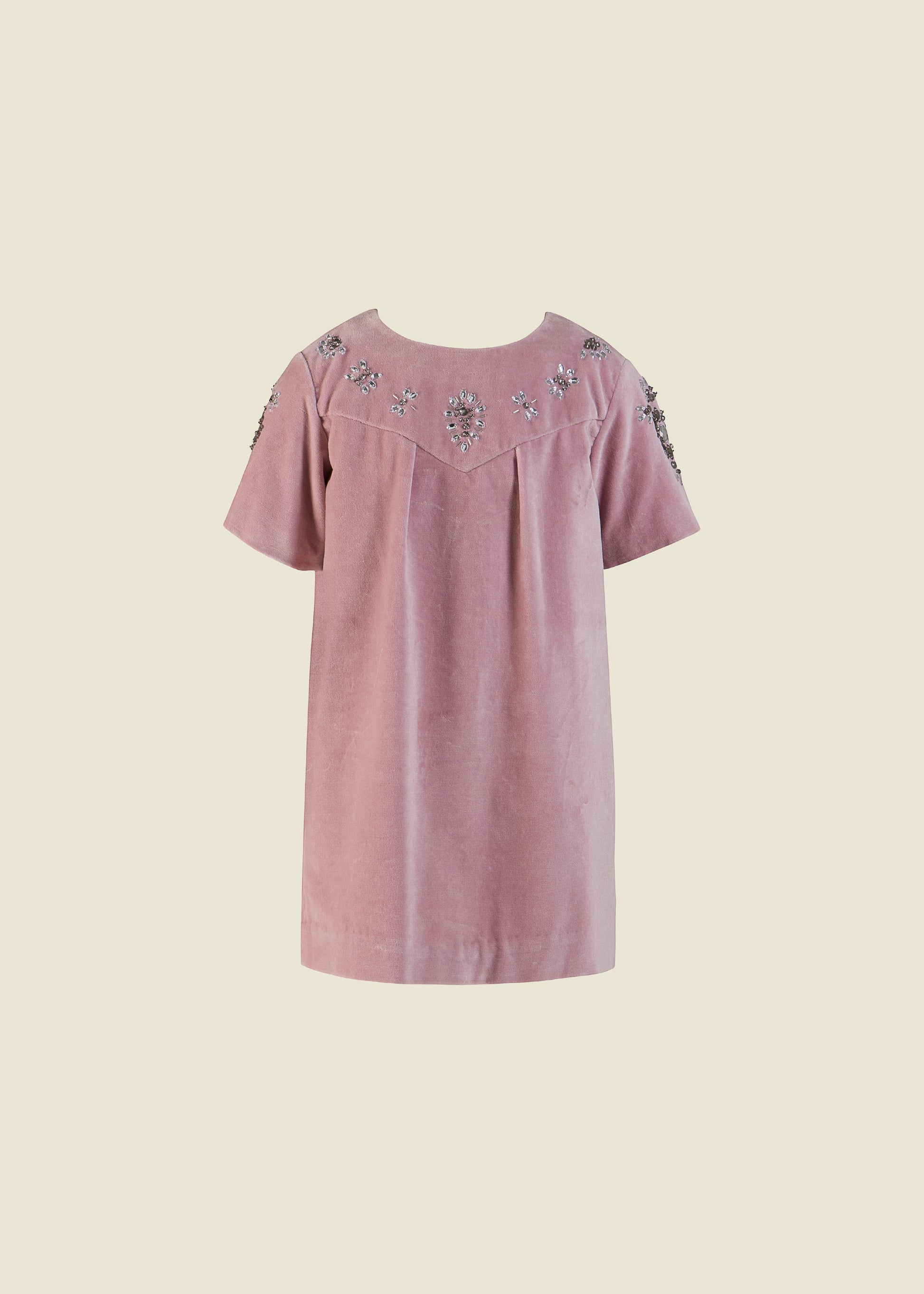 Soft cotton velvet short sleeves dress. Hand embroidered yoke with rhinestones and beads making it a perfect and easy party dress choice.