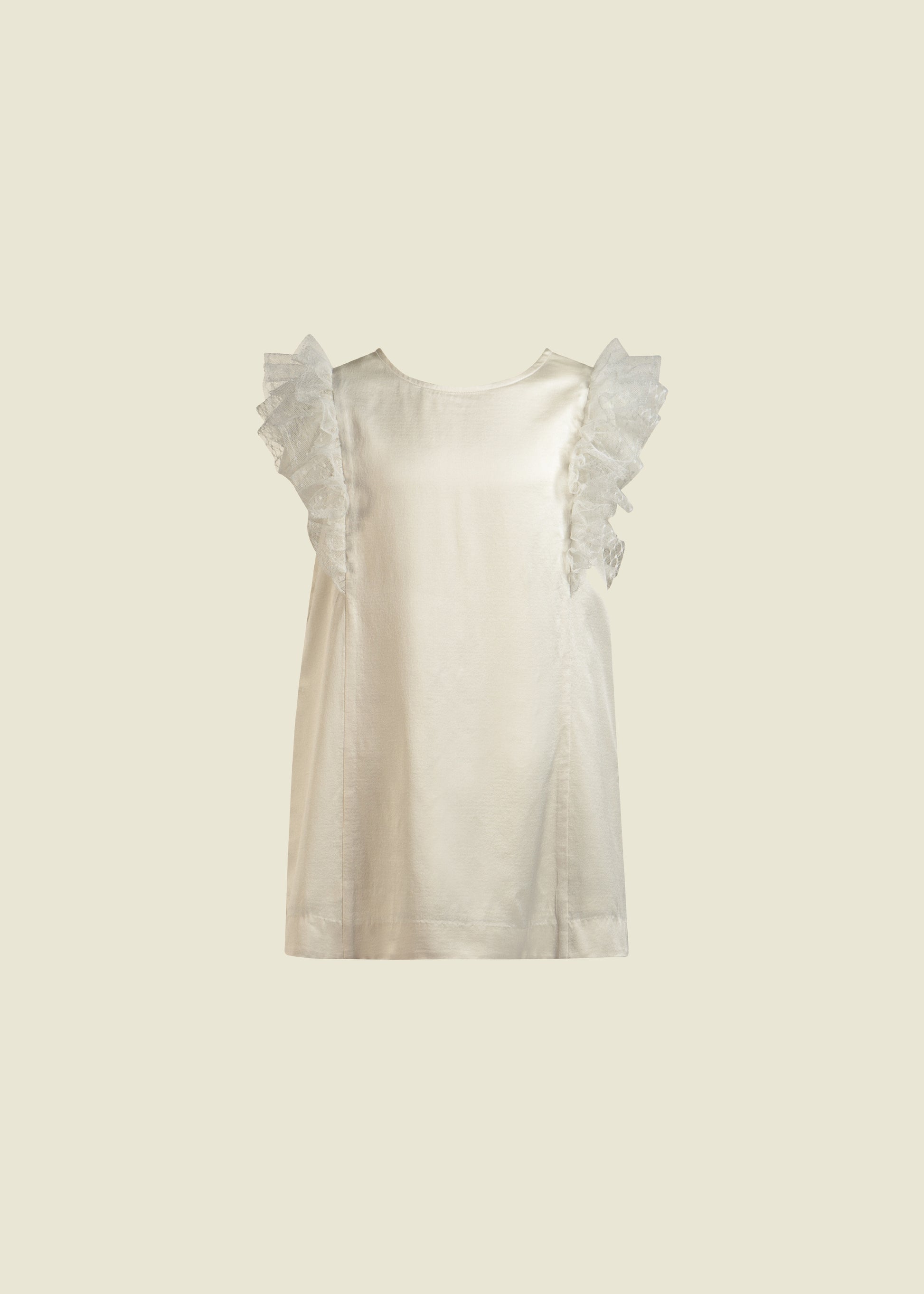A great for all occasions well-cut straight white dress in a fine satin silk. Frill sleeves designed with different dobby silk tulles. Silent luxury at its best!